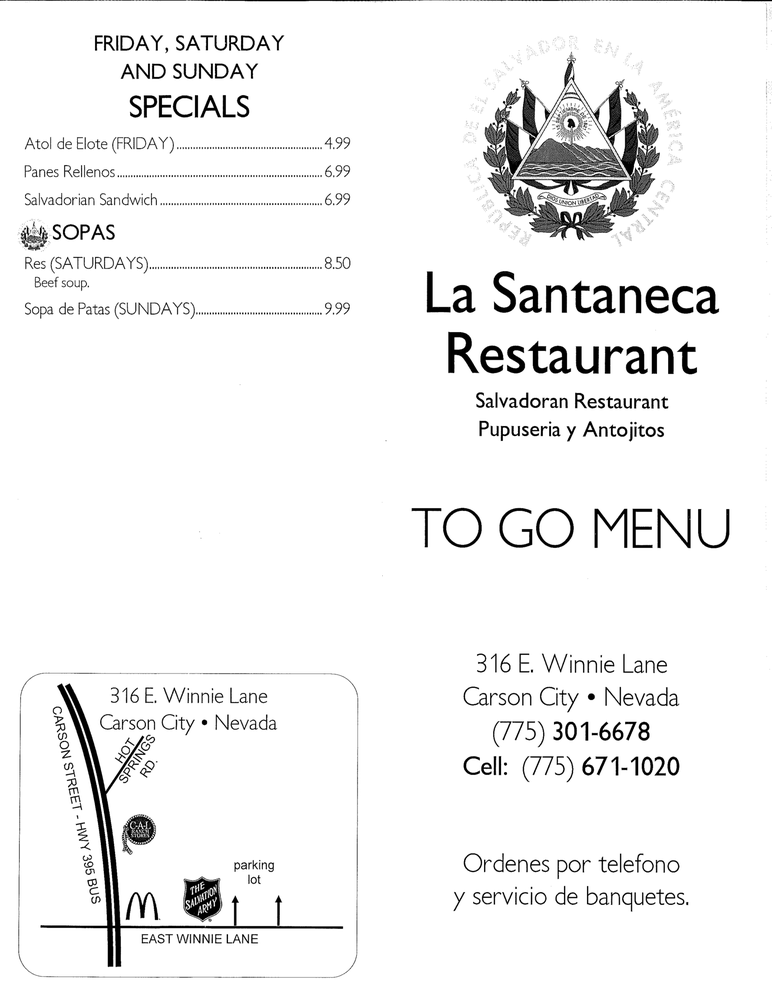 La Santaneca is a Salvadoran restaurant that offers a wide range of traditional dishes with a modern twist. Located in Carson City, NV, this restaurant provides a casual and welcoming atmosphere, perfect for families and groups. The menu features delicious options like Huevos con Jamon, Sopa de Pata, and Ensalada de Pollo. Customers rave about the pupusas, organic chicken soup, and carne asada. The friendly owner adds to the inviting ambiance and provides helpful recommendations for the best dining experience. With a diverse selection of pupusa combinations and flavorful dishes, La Santaneca is a must-try for anyone looking to explore authentic Salvadoran cuisine. Experience the vibrant flavors and warm hospitality at La Santaneca for a memorable dining experience.