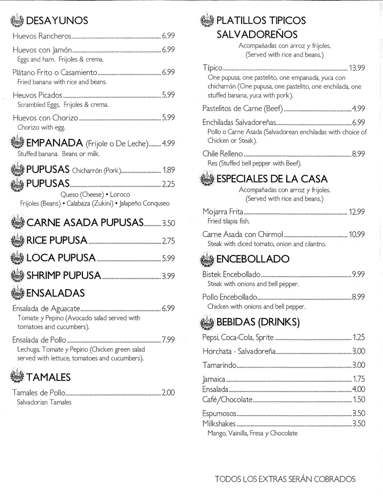 1 pupusa, yuca, 1 pastelito, 1 enchilada & 1 empanada. Empanada choices: plantains, beans or milk.